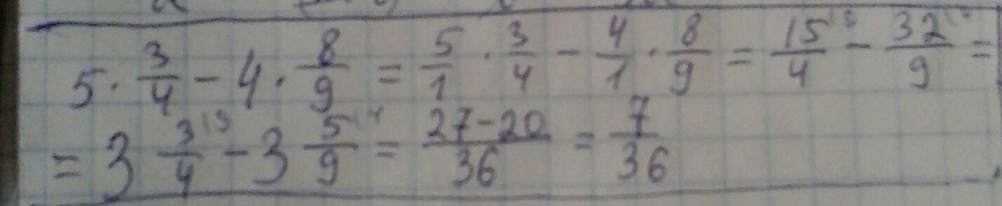 5 • 3/4 - 4 • 8/9 = 15/4 - 32/9 = 7/36