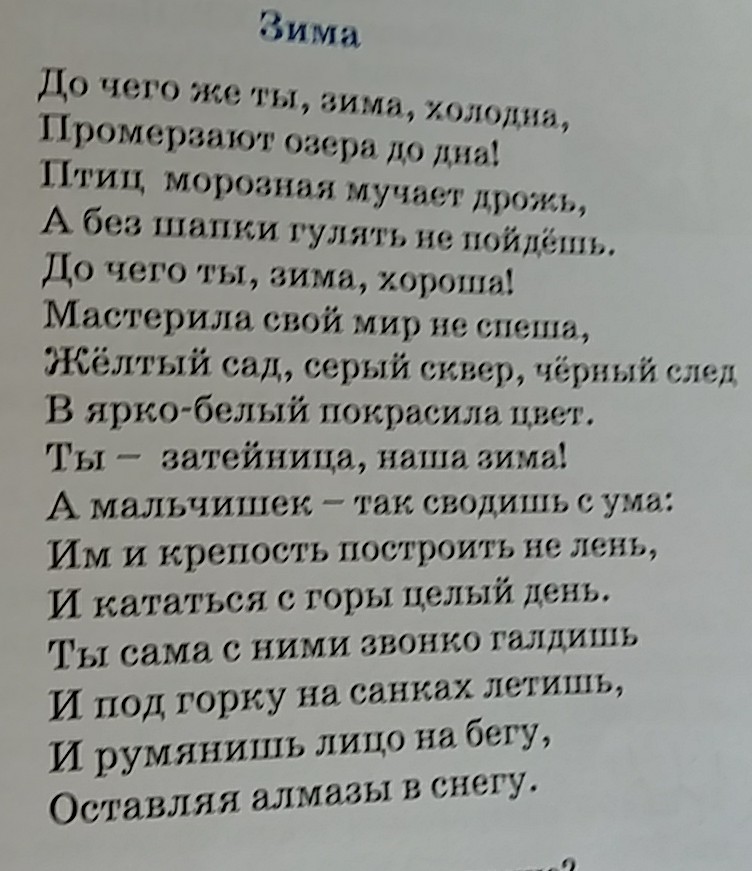 автор обращается к зиме как к человеку он говорить " до чего же ты зима холодна " еще " до чего ты зима хороша " тут автор хвалит и восхищается зимой " мастерила свой мир не спеша" здесь тоже идет обращение к зиме. Автор хочет сказать что зима "строит свой мир " делает наш мир намного красивее к примеру узоры на окнах тут тоже обращение к зиме " ты затейница наша зима, а мальчишек ты сводишь с ума " тут имеется в виду что мальчики как бы более активные ( неточно ) бегают и кидаются снежками в девочек . Суть в том что автор обращается к зиме как к человеку называет ее на ты и приводит различные примеры что происходит зимой.