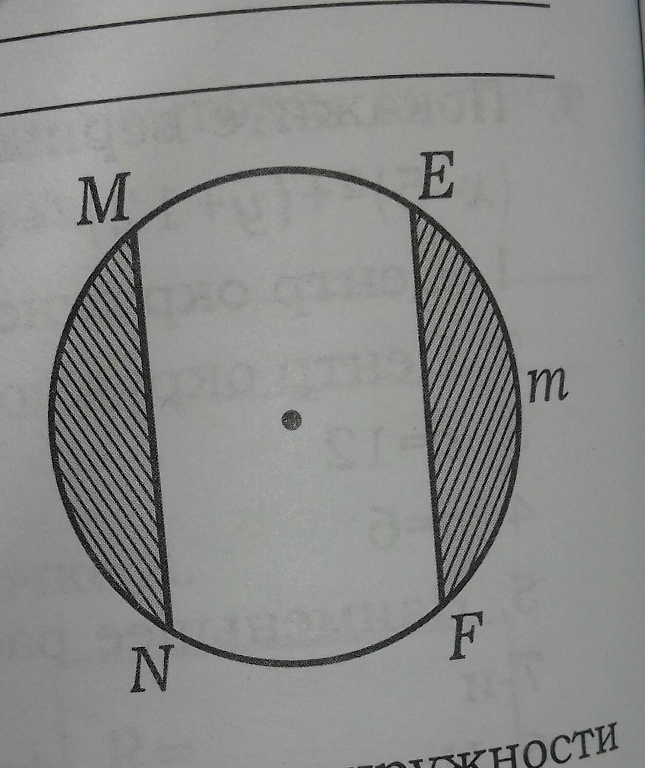 В окружности с радиусом 6 см хорды MN и EF находятся на одинаковом расстоянии от центра. Найдите площадь заштрихованной части если дуга EmF=90° (пи=3)