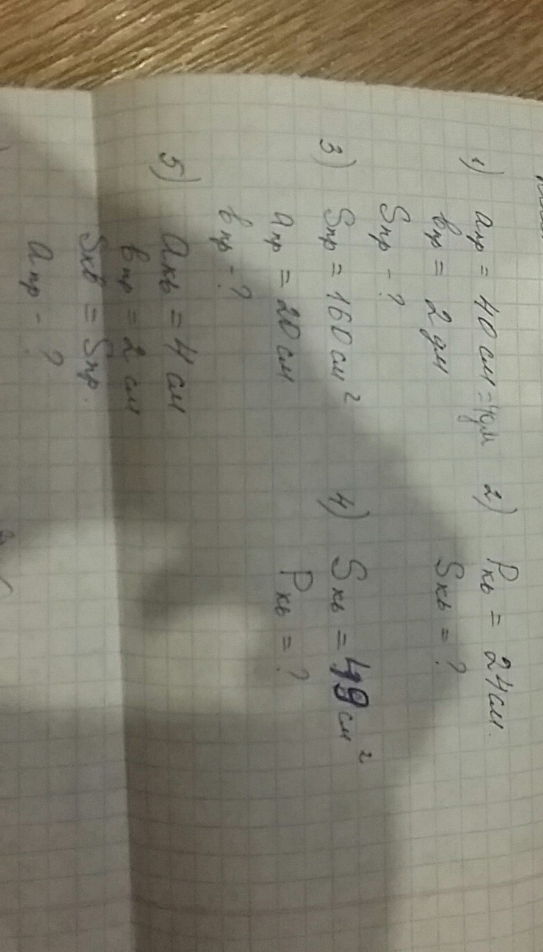 5) S (квадрата) = а^2 = 4^2 = 16см^2; S (прямоугольника) = S (квадрата) = 16см^2; S (прямоугольника) = a*b => a = S/b = 16/2 = 8см