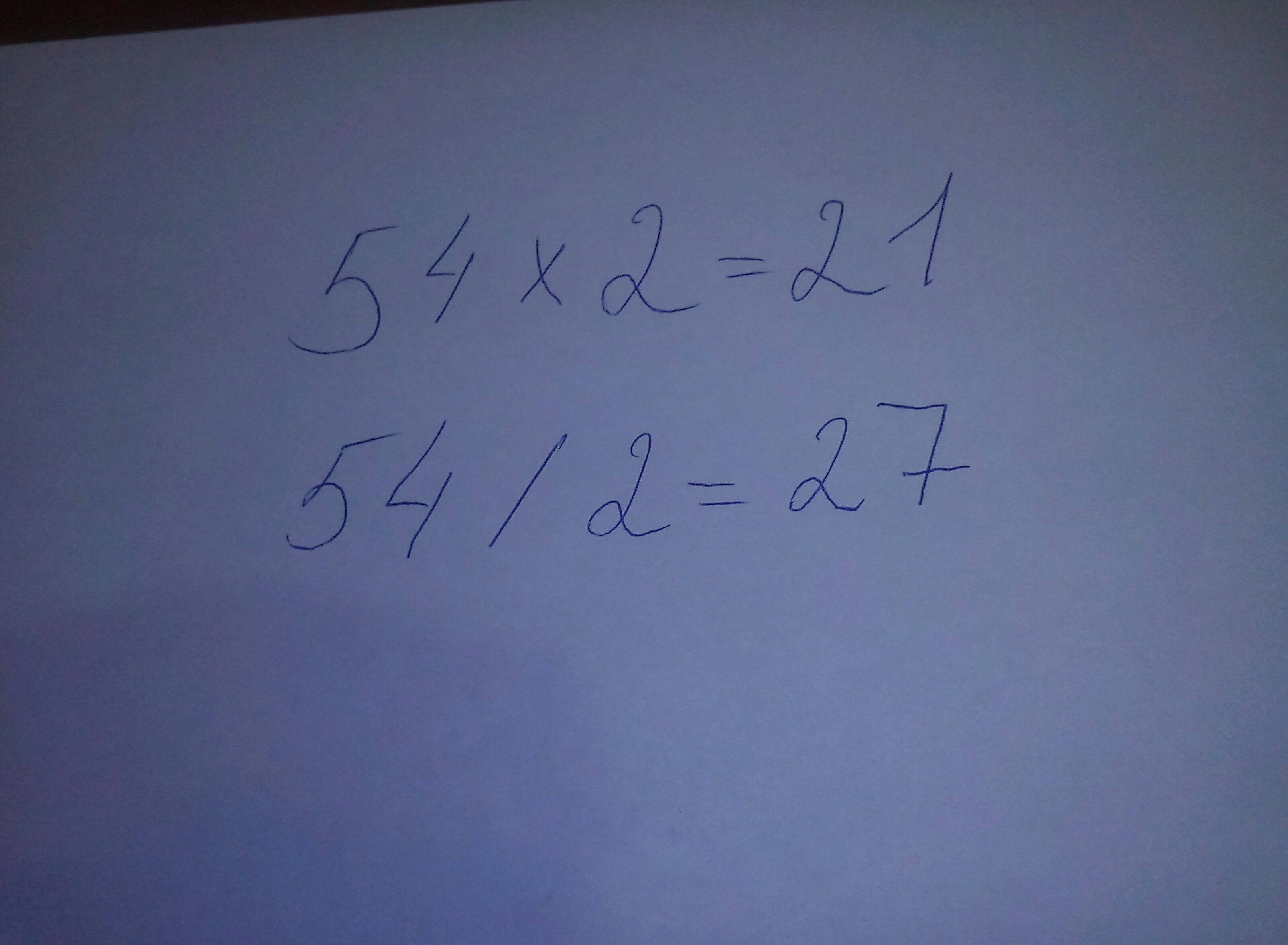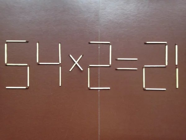 ты забираешь одну спичку с знака умножения и тебя выход действие деление. лишнюю спичку ты ставишь к единице и выходит 7. тоесть 54/2=27.