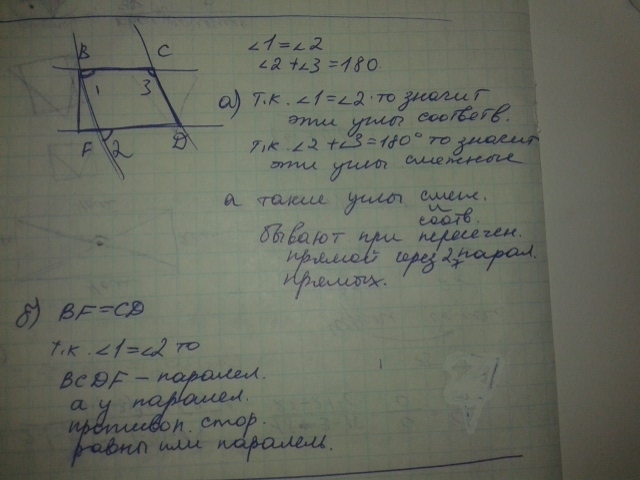 Угол 1 =углу 2,угол2+угол3 =180градусов. а)Верно ли что BC параллельно AD,
