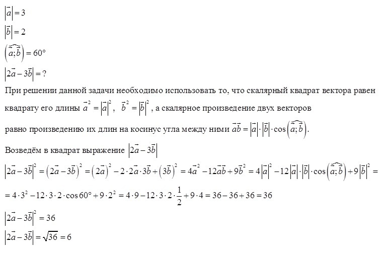 Даны векторы a и b, |a|=3, |b|=2, угол (a;b)=60°. Найдите |2a-3b|.