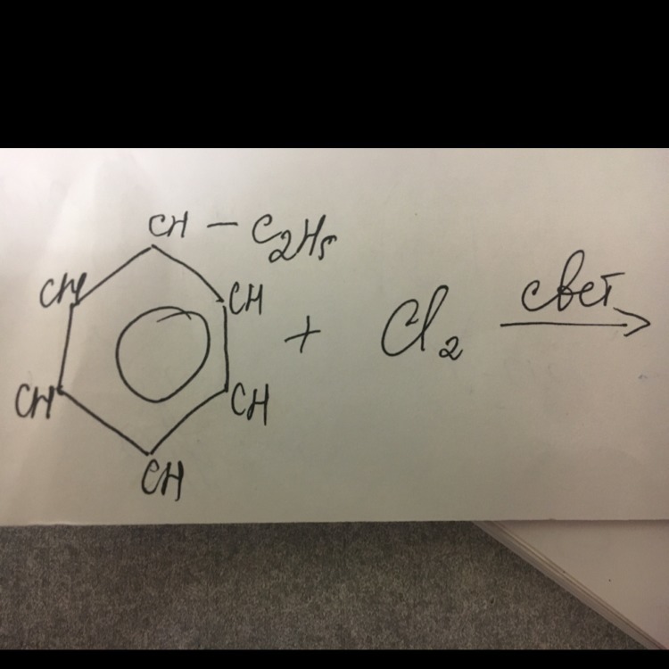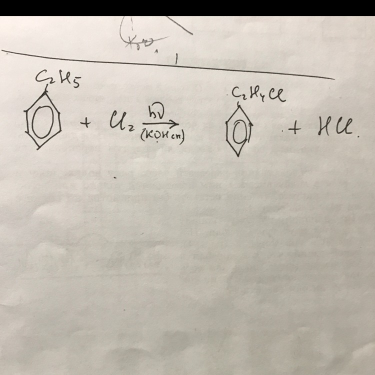 это реакция электрофильного замещения, на свету хлор присоединится к бензольному кольцу в орто или пара положение, так как С2Н5 ориентант 2рода. в качестве побочного продукта выделится соляная кислота .