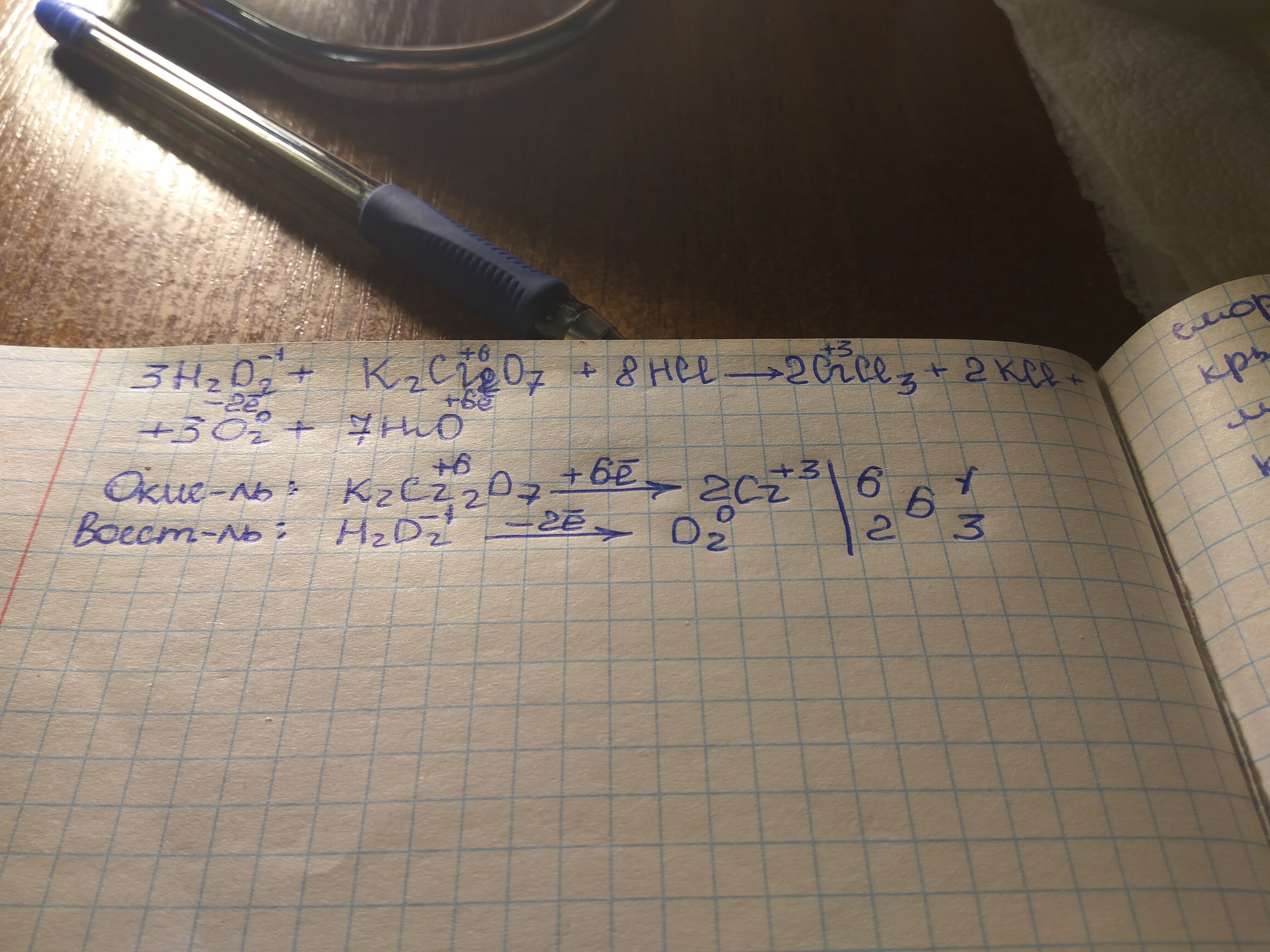 h202+k2cr2o7+hcl=crcl3+kcl+o2+h20 расставьте коэфициенты в схеме реакции методом электронного баланса, укажите окислитель и восстановитель.