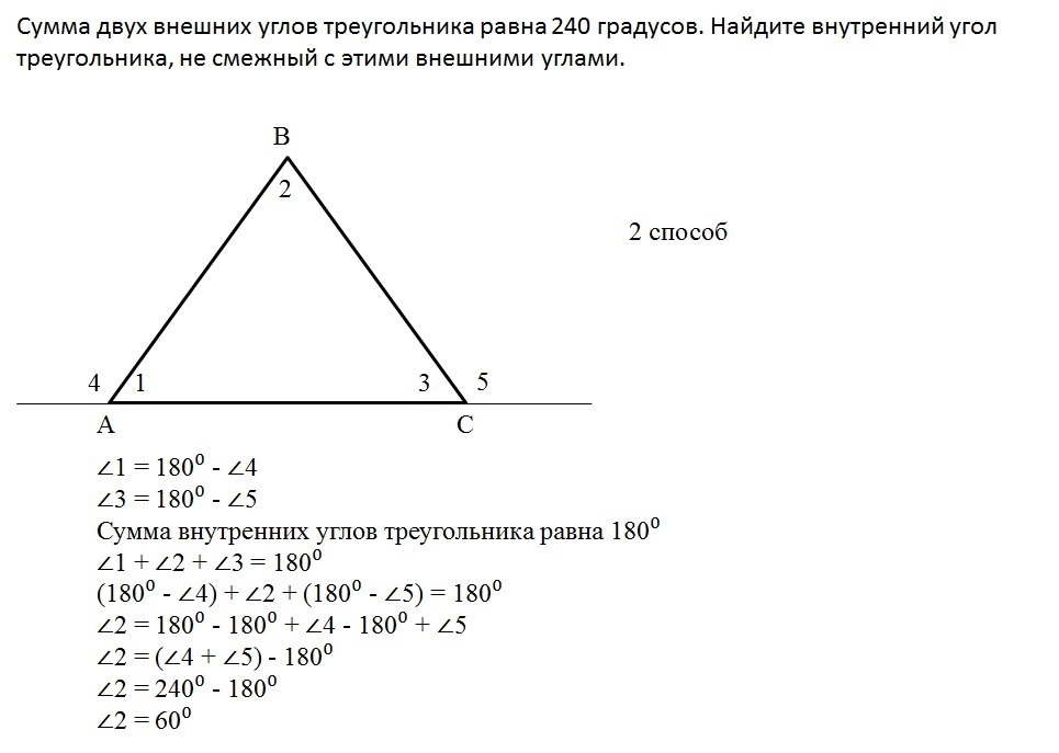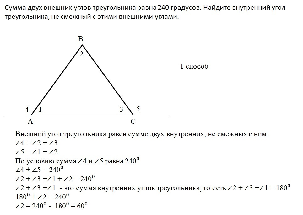 Сумма двух внешних углов треугольника равна 240 градусов. Найдите внутренний угол треугольника не смежный с этими внешними углами.