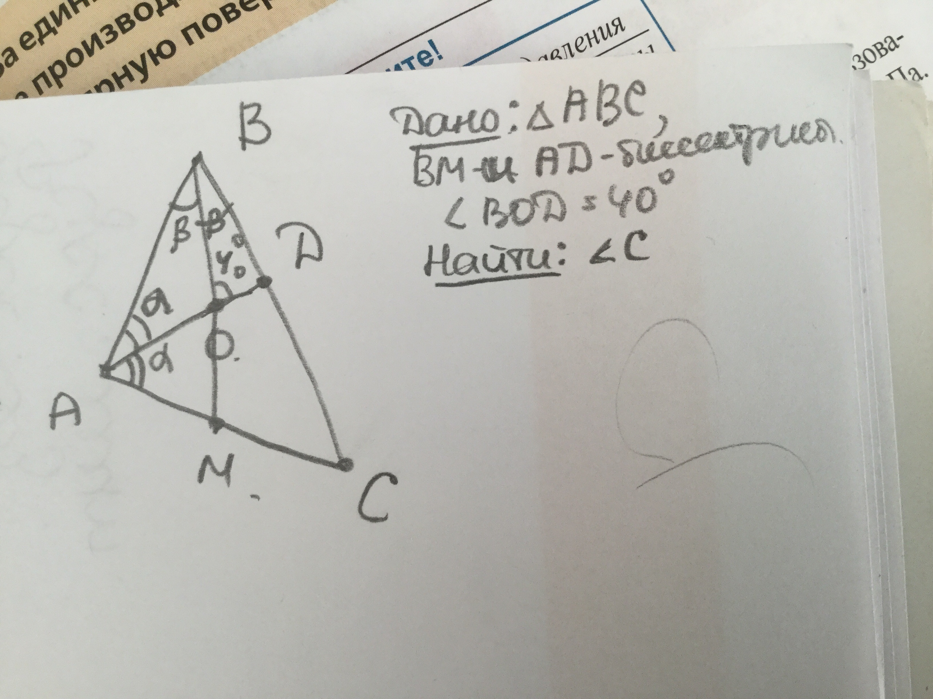 в треугольнике АВС биссектрисы углов А и В пересекаются под углом 40°.найдите угол С треугольника.
