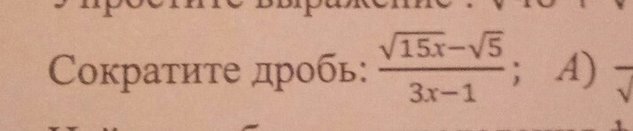frac{ sqrt{15x}- sqrt{5}  }{3x-1} = frac{  sqrt{5} sqrt{3x}- sqrt{5}  }{( sqrt{3x}-1 )( sqrt{3x}+1 )} = frac{  sqrt{5}( sqrt{3x}- 1)  }{( sqrt{3x}-1 )( sqrt{3x}+1 )} =frac{  sqrt{5} }{ sqrt{3x}+1 }