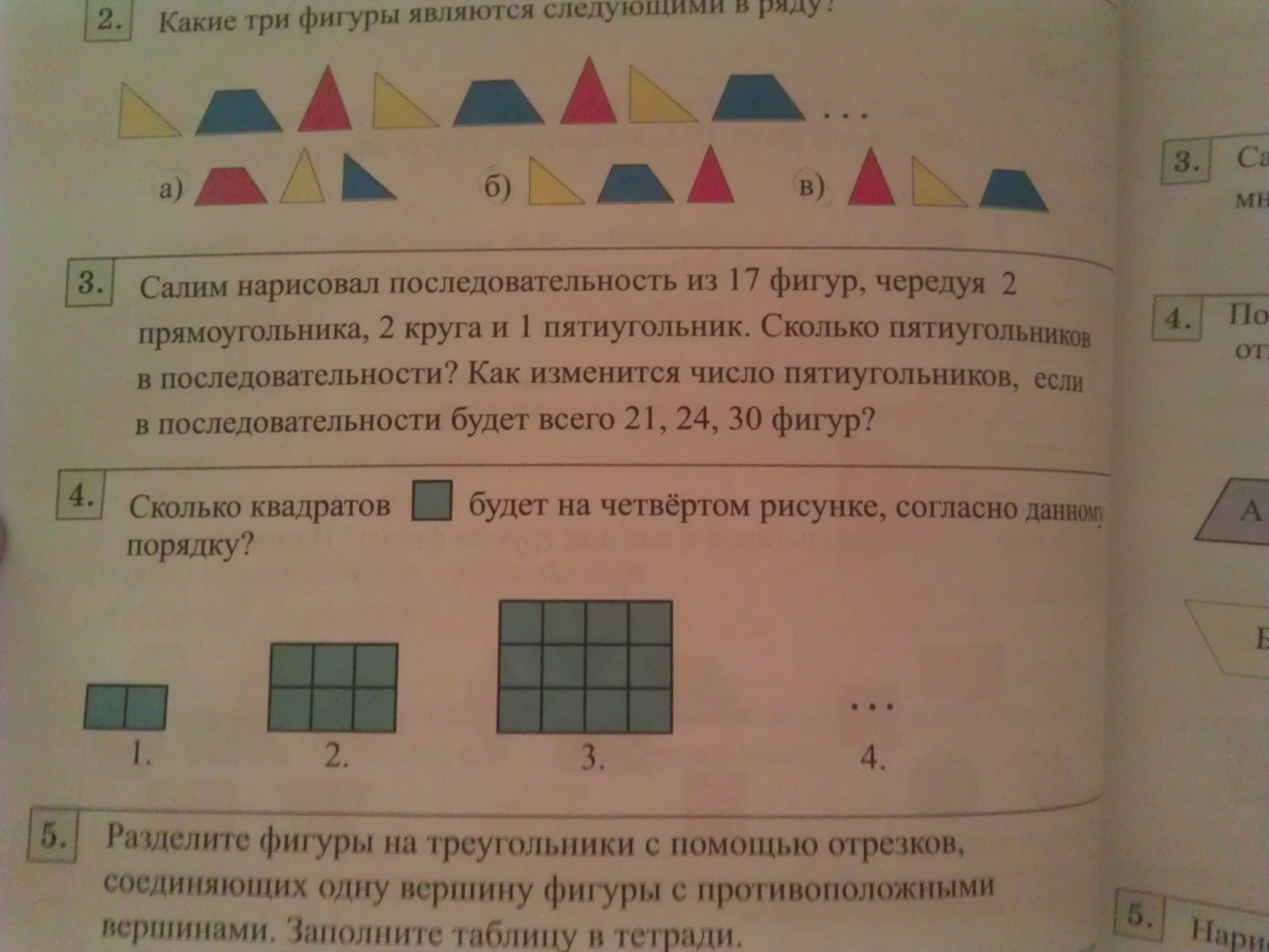 17 : 5 = 3целых групп и 2фигуры в остатке Эти 2 в остатке будут прямоугольники. Поэтому пятиугольников будет 3 - по числу целых групп