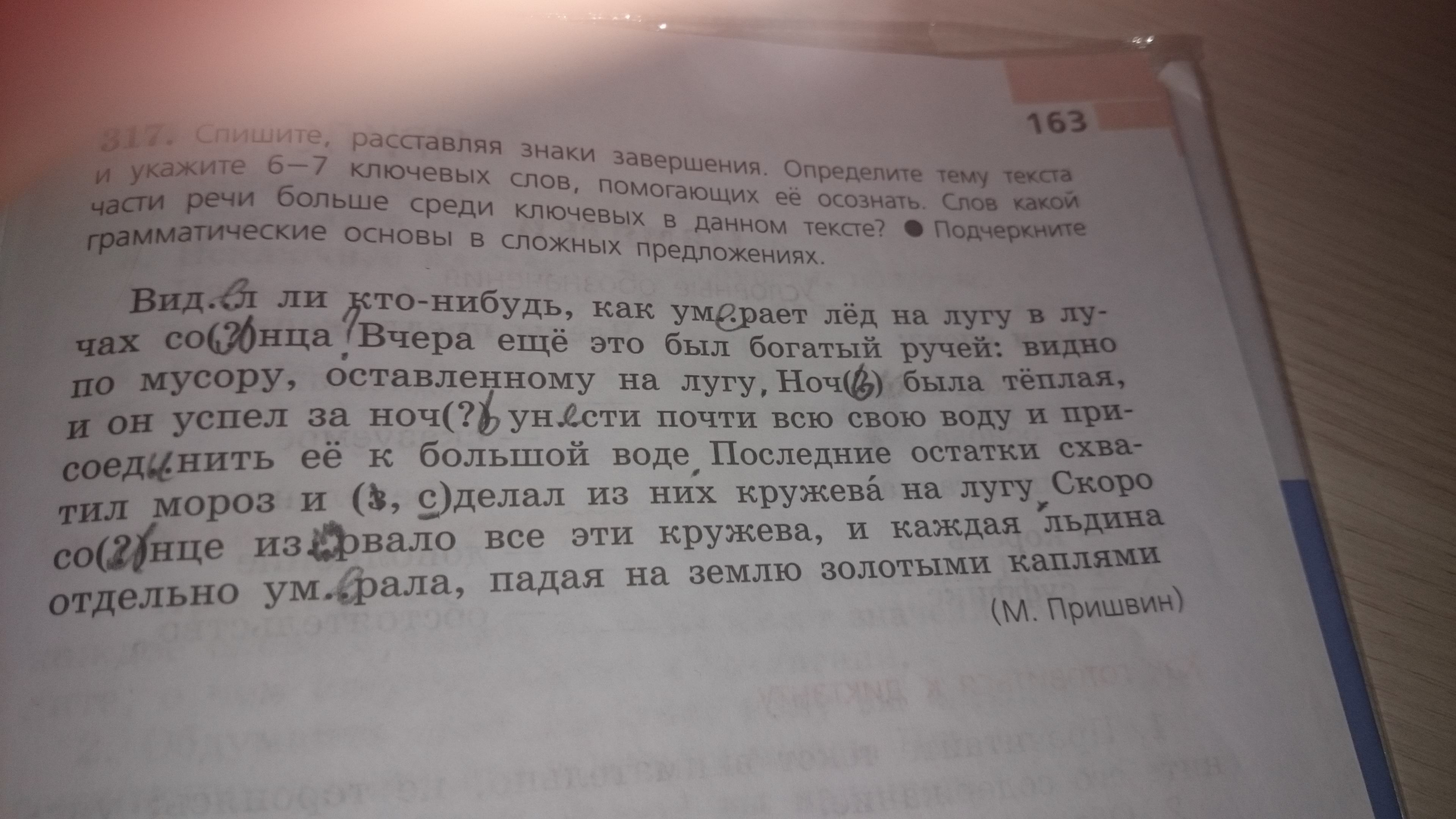 Ключевые слова: лёд, умирает, солнце, ночь, тёплая, вода, ручей. Больше всего среди них имён существительных.