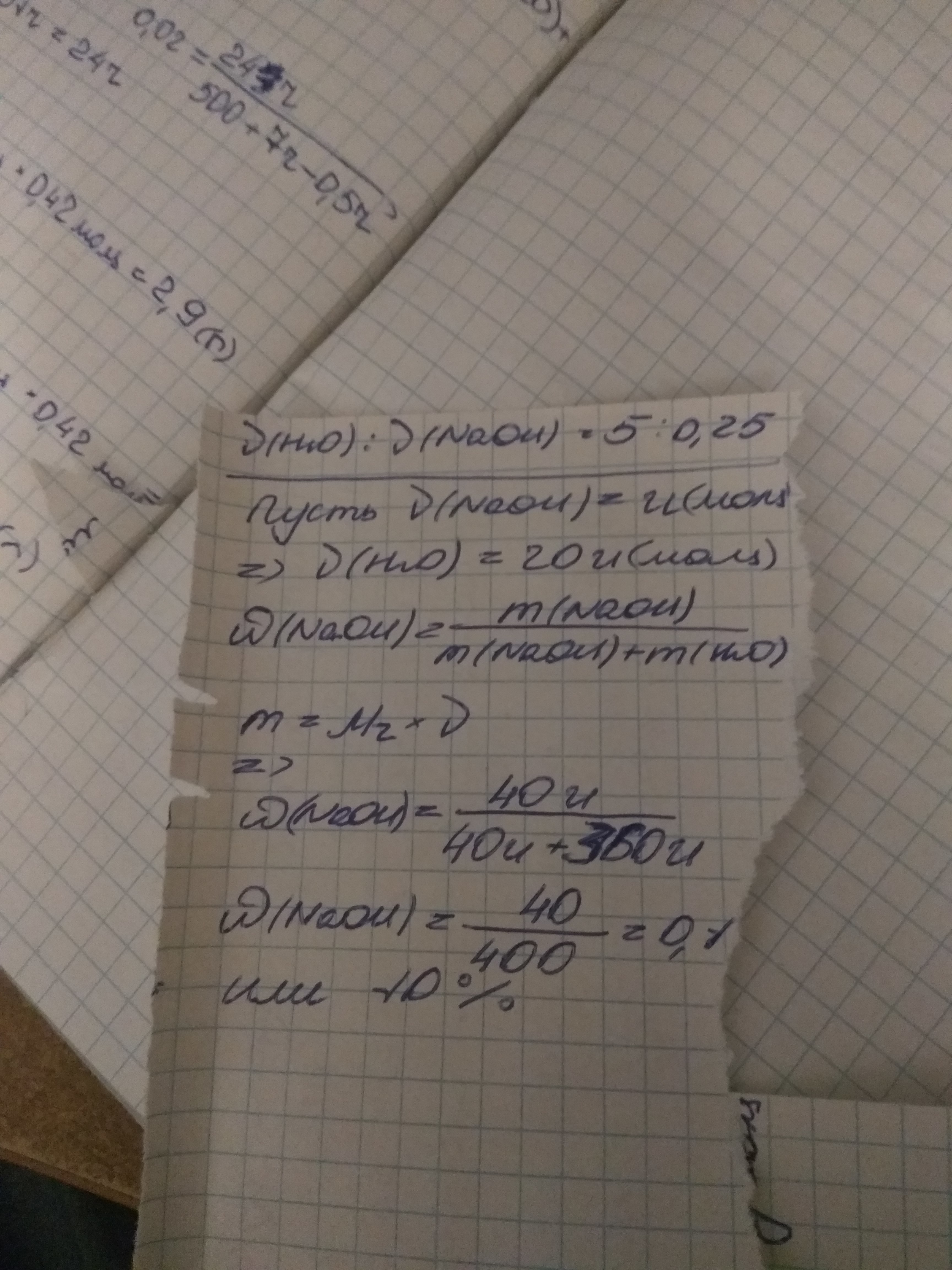 Вычислите массовую долю щёлочи в растворе, если отношение числа молей NaOH и воды 0,25:5 Мr(NaOH) 40 , h2o= 18