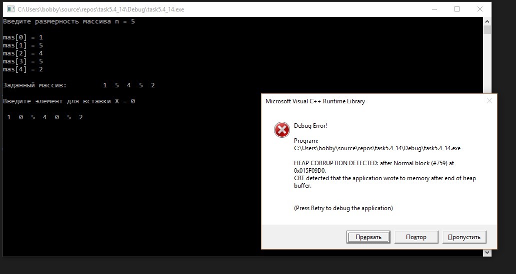 Когда вы вставляете элемент в массив, вы увеличиваете размерность этого массива, но при этом, в начале программы вы создаете его, размером n, а потом, пишете, что выведи k элементов этого массива, хотя k>n