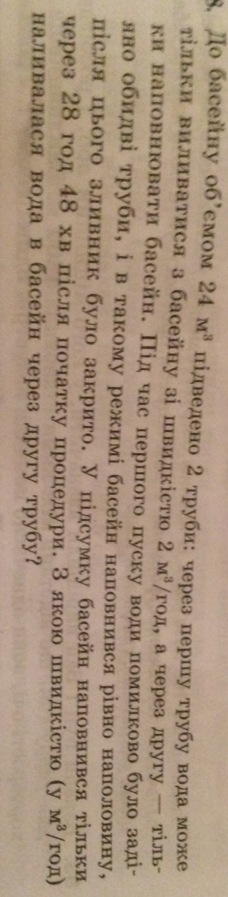 К бассейну объемом 24 м3 подведены 2 трубы: через первую трубу может только выливаться со скоростью 2 м3 / ч, а через вторую только наполнять бассейн .Во время первого пуска воды ошибочно было задействовано обе трубы, и в таком режиме бассейн наполнился ровно на половину, после этого Стоки были закрыты .В итоге бассейн наповнися только через 28 часов 48 минут после начала процедуры .С какой скоростью (в м3 / час) наливалась вода в бассейн через вторую трубу
