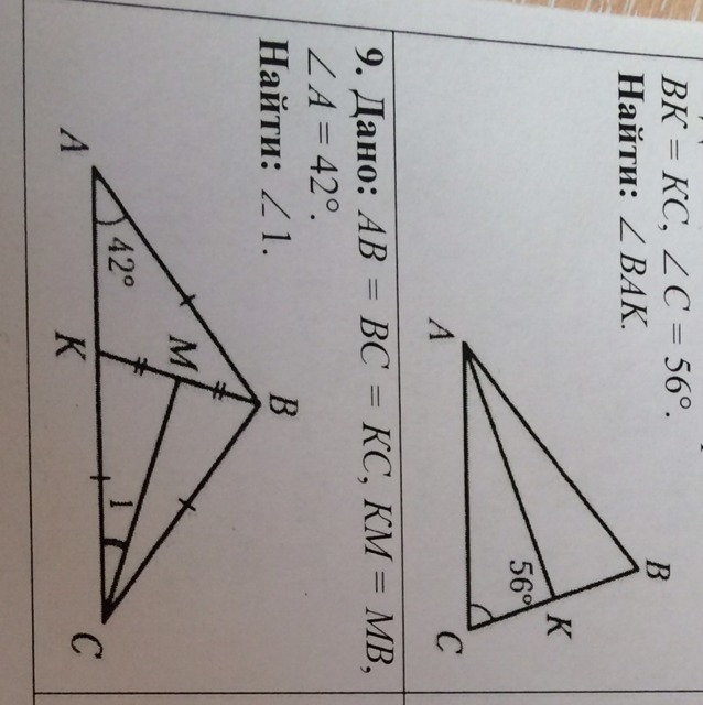 2)ΔBCK также равнобедренный и CM медиана и биссектриса⇒∠BCM=∠KCM=∠1=1/2∠C=1/2*42=21°
