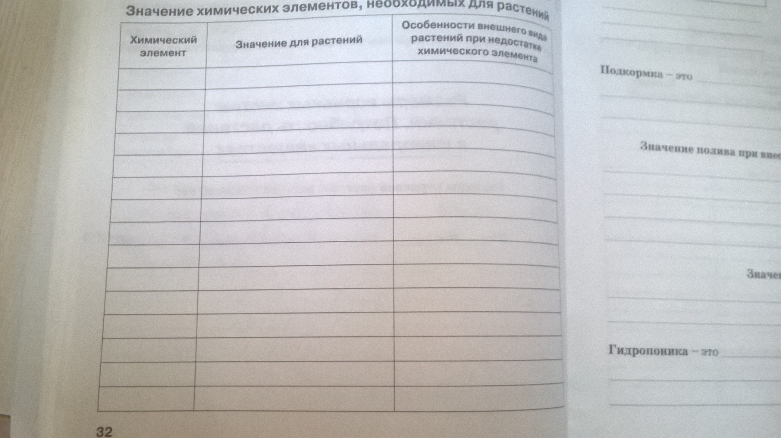 1. Азот (N) - значение: образование белков и витаминов группы В - особенности внешнего вида: - пожелтевшие нижние листья, ослабление роста боковых побегов, мелкие плоды и листья.