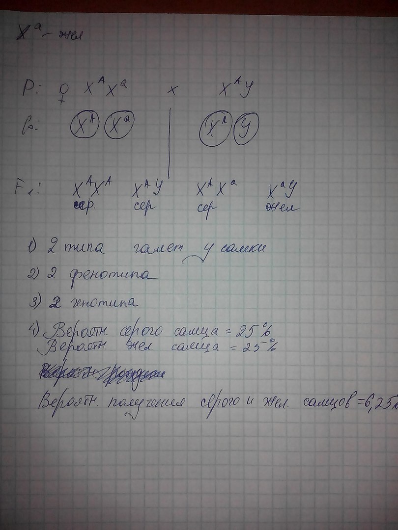 Фенотипы: серые самцы - Х^АУ, серые самки -Х^АХ^А и Х^АХ^а, желтые самцы - Х^аУ. Генотипы самцов: Х^АУ - серые самцы, Х^аУ-желтые самцы