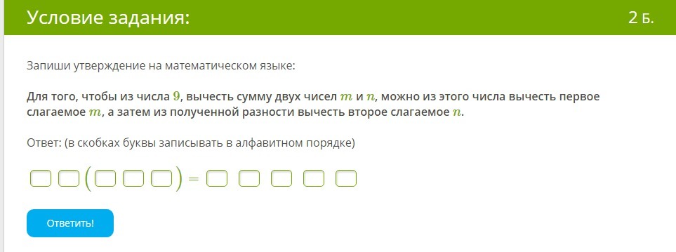 Для того, чтобы из числа 9, вычесть сумму двух чисел m и n, можно из этого числа вычесть первое слагаемое m, а затем из полученной разности вычесть второе слагаемое n.