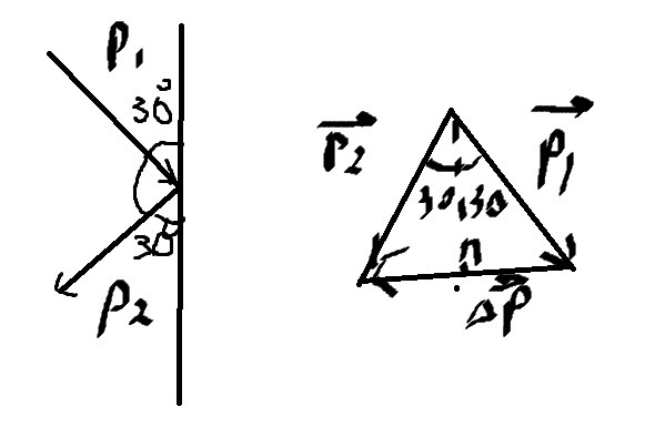 Помогите решить.Шарик массой m=200 г ударился о стенку со скоростью v = =10 м/c и отскочил от нее с такой же скоростью. Определить импульс Р, полученный стенкой, если до удара шарик двигался под углом a = =30° к плоскости стенки?