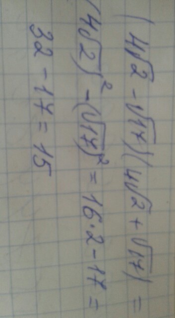 (4*√2-√17)*(4*√2+√17)=(4*√2)²-(√17)²=4²*2-17=16*2-17=32-17=15.
