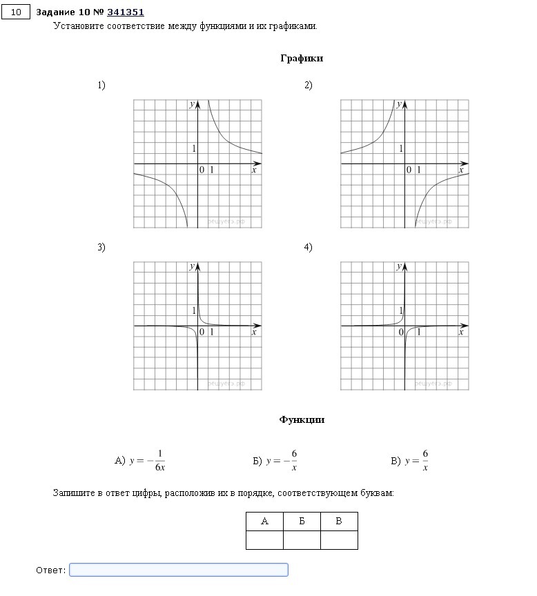 10. В данном случае, все функции на рисунке - гиперболы. Если стоит минус, значит функция будет проходить через 2 и 4 четверть. Т.е. 1 четверть - все положительные(x и y), 2 четверть - x отрицателен, y положителен, 3 четверть - x отрицателен, y отрицателен, 4 четверть - x положителен, y отрицателен. Если в числителе стоит 1, то график будет приплюснут, а если в числителе стоит что-то больше 1, то график будет расширяться, в зависимости от коэффициента. Если это сложно для понимания, то можно просто подставлять координаты в уравнение и смотреть, какой график подходит.