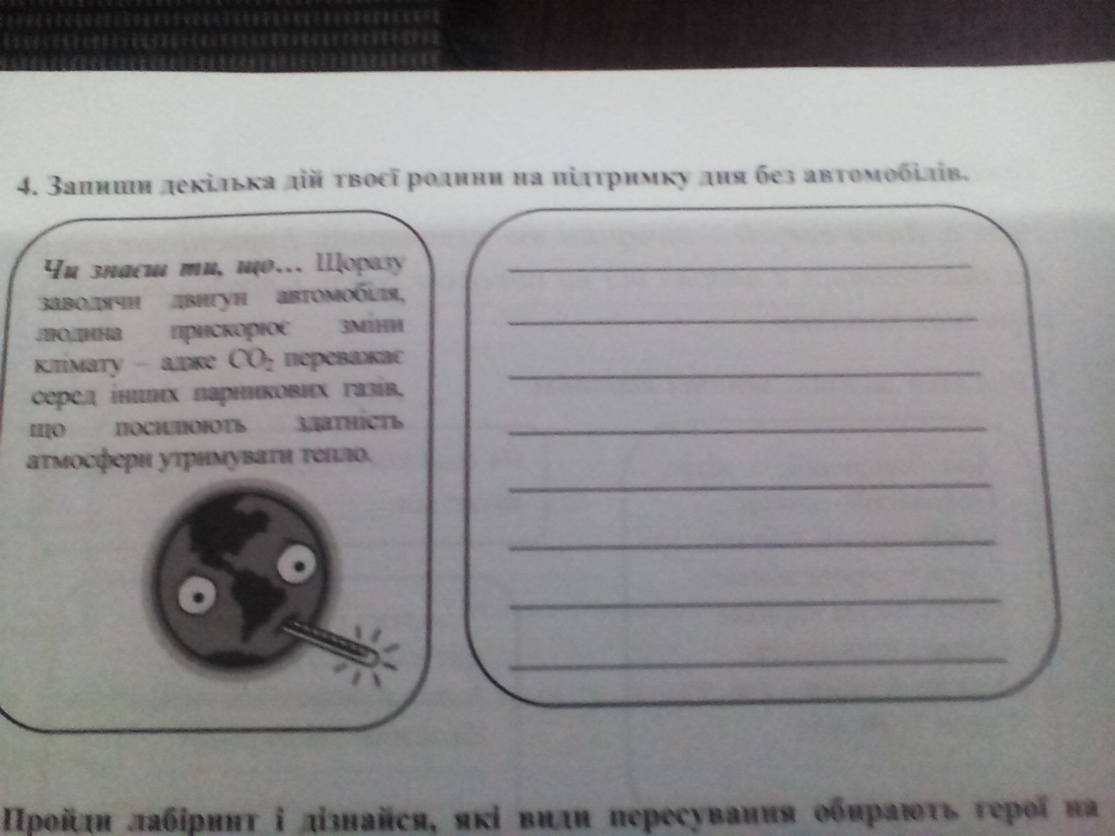 Ми з родиною у цей день ïздили би на велосипедах або ходили би пiшки, не використовуючи автомобiль; просили би усiх знайомих робити теж саме i повiдомляли би усiх про шкiдливiсть автомобiлiв