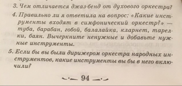 не входит: барабан, балалайка, баян, добавила бы: литавры, скрипка,флейту. Я бы включила: балалайка, ложки, баян, или гармошка, рожок, гусли, трещётки, пувиклы, сопилка.
