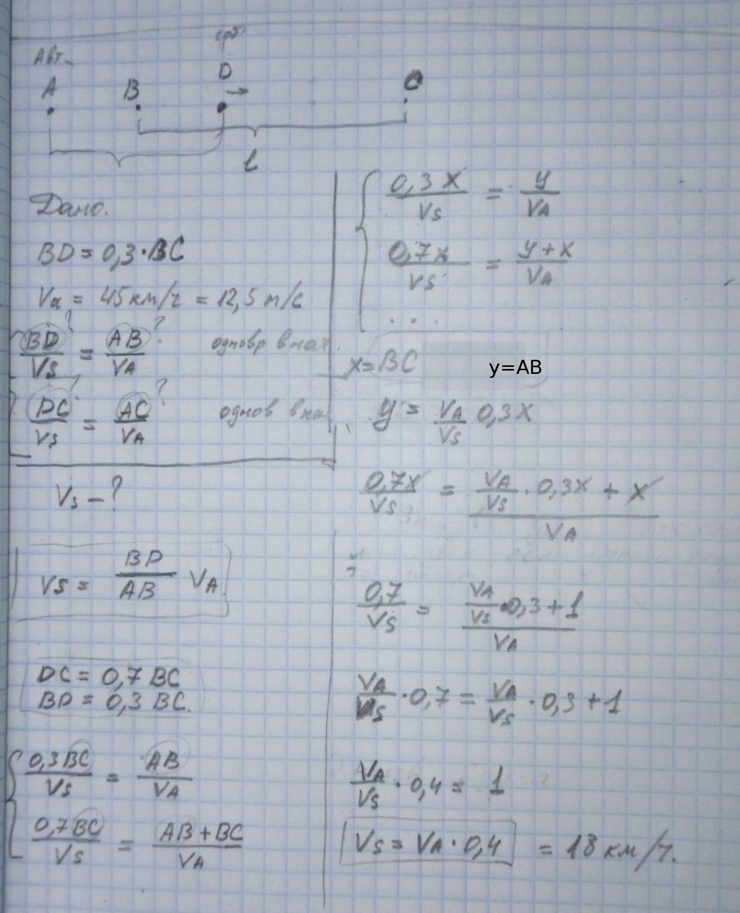 Все, что после пункта 6) - лишнее, т.к. из него сразу следует ответ. Но вы решили создать себе лишнюю работу и пошли на второй круг, выражая уже известные переменные. При этом так и не дошли до конца этого круга :)) Ведь из вашего же пункта 8) следует, L/x=2c/(0.6a) и из 6) следует, что c/a=0.4, откуда L/x=(2*0.4)/(0.6)=4/3 и тогда по вашему же ответу: с=13.5*4/3=18. Так что надо исправить, ответ здесь только 18. А у вас мало того что лишняя работа делается, так она еще и не доделана до конца.