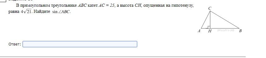В прямоугольном треугольнике ABC катет AC = 25, а высота CH, опущенная на гипотенузу, равна 4 корень из 21 . Найдите sin угла abc.