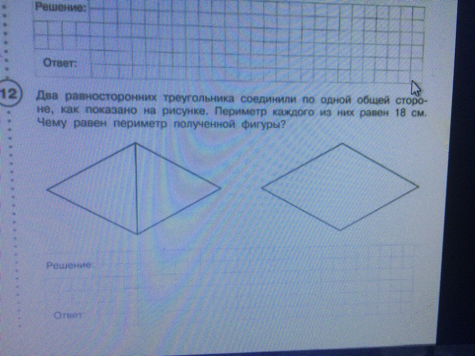 Два равносторонних треугольника соединили по одной общей стороне,как показано на рисунке. Периметр каждого из них равен 18 см. Чему равен периметр полученной фигуры?