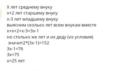 Сумма возрастов трех внуков равна возрасту их деда. Старший внук старше среднего на 2 года, а средний старше младшего на 3 года. Если сумма возрастов всех внуков вместе с дедом 152 года, то сколько лет среднему внуку?