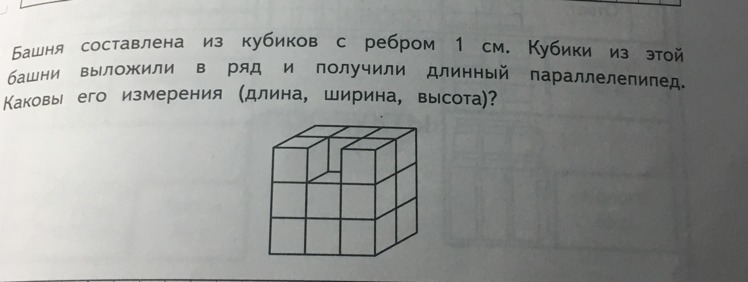 Башня составлена из кубиков с ребром 1 см. Кубики из этой башни выложили в ряд и получили длинный параллелепипед. Каковы его измерения ( длина, ширина высота)?