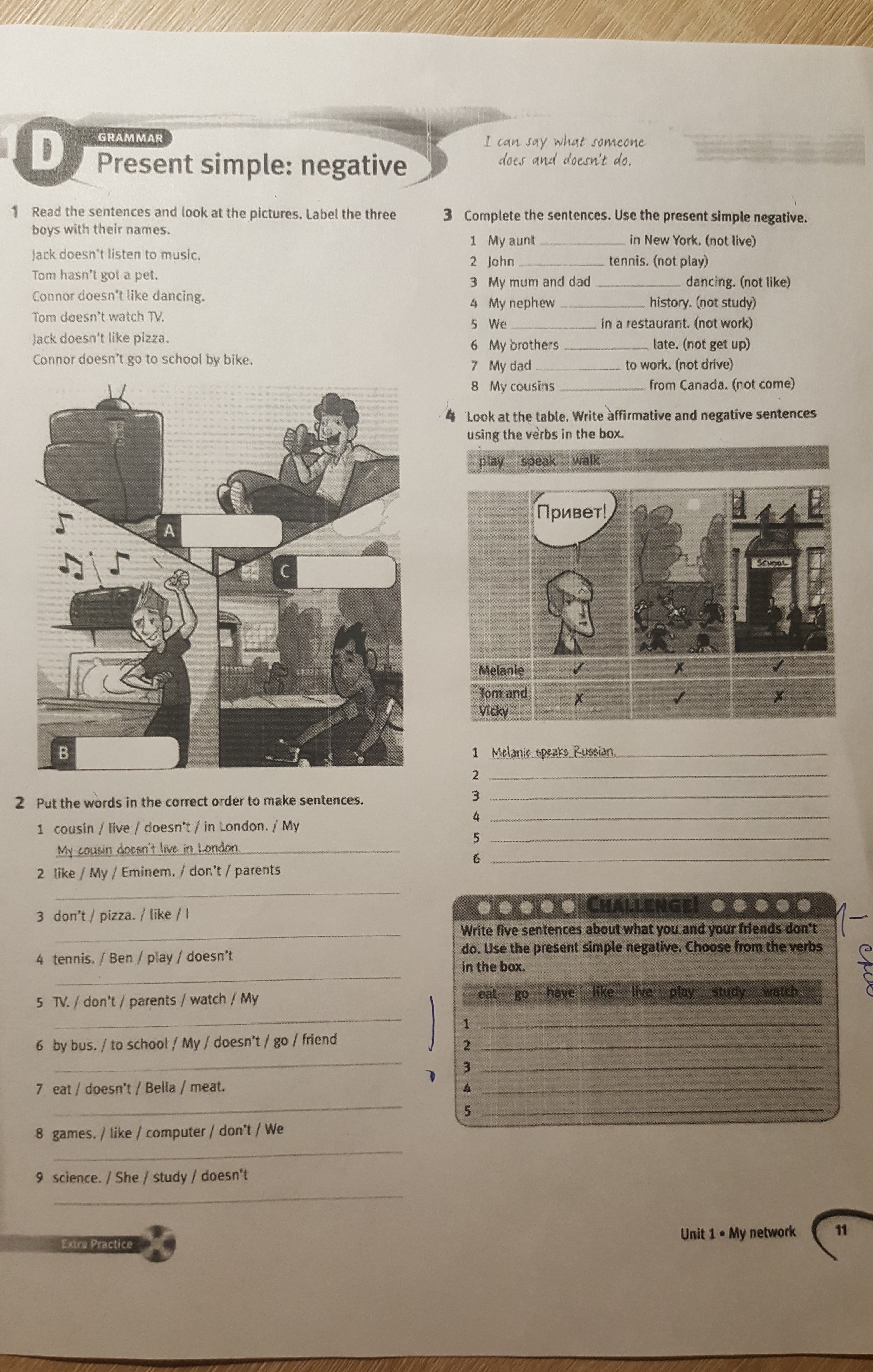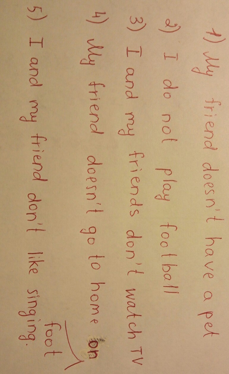2My parenst dont like Eminem.3 I dont like pizza 4 Ben doesent play tennis 5 My parents dont watch TV 6 My friend doesent go to school by bus 7 Bella dosent eat meat 8 We dont like computer games 9 She doesent study science