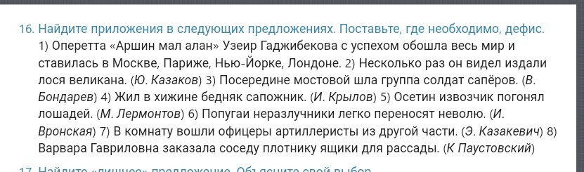 Дефисы: лося-великана, солдат-сапёров, бедняк-сапожник, осетин-извозчик, попугаи-неразлучники, офицеры-артиллеристы, соседу-плотнику.