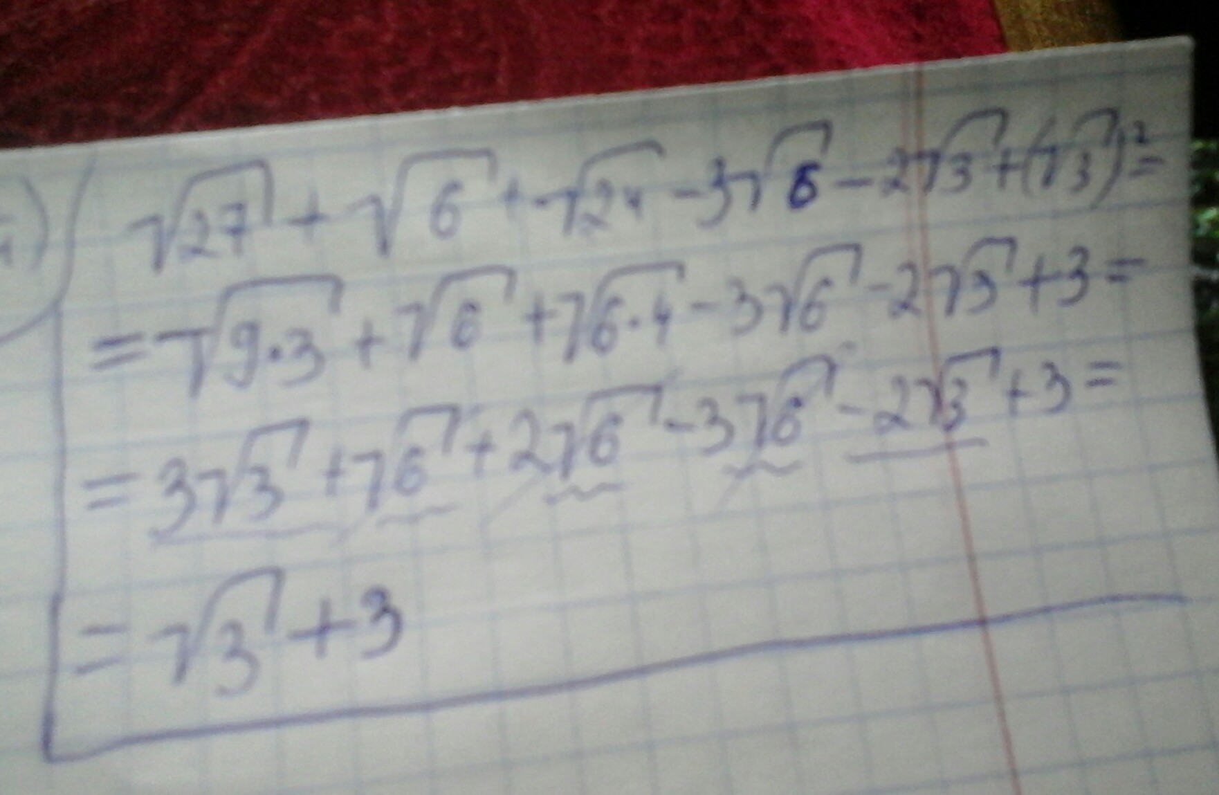 найти значение выражения ( корень из 27 плюс корень из 6 плюс корень из 24 минус 3 корень из6 минус 2 корень из3 плюс корень из 3) в квадрате