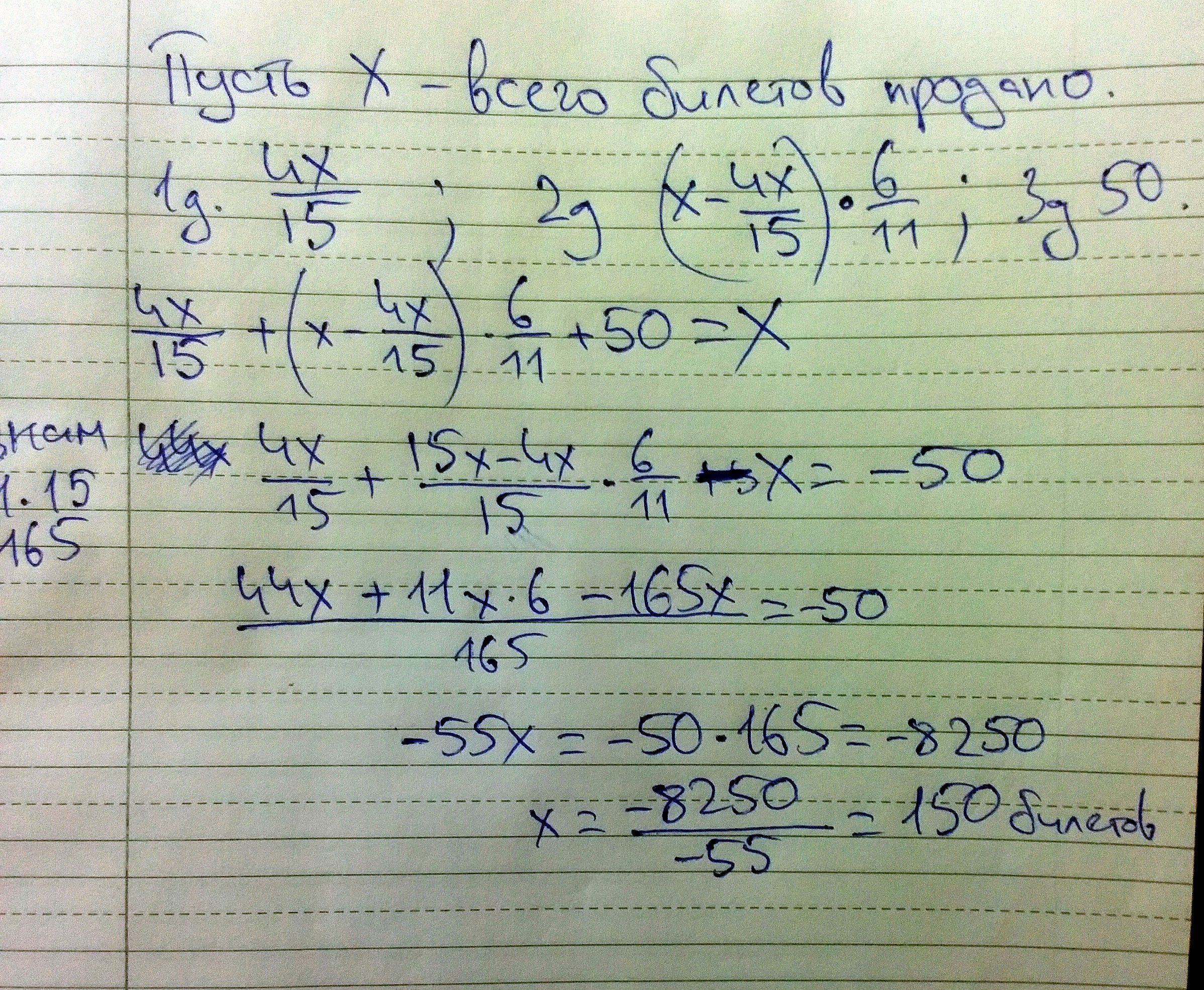 Билеты на выставку распродали за 3 дня. за первый день было продано 4/15 всех билетов, за второй день 6/11 оставшихся, а в третий день последние 50 билетов. Сколько билетов было продано за 3 дня?