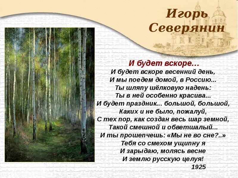 "Король поэтов" Серебряного века,Игорь Северянин, написал стихотворение "И будет вскоре весенний день.." в 1925 году.Находясь в вынужденной иммиграции,поэт не переставал думать о России, называя себя дачником,а не иммигрантом.Поэт держался подальше от политики,не выступал против Советской власти.Мысленно он был в России, тосковал по Родине и мечтал вернуться.Герой стихотворения-лирик, хотел вернуться в старую,спокойную,умытую Россию,ту, которую он помнил и которую любил.