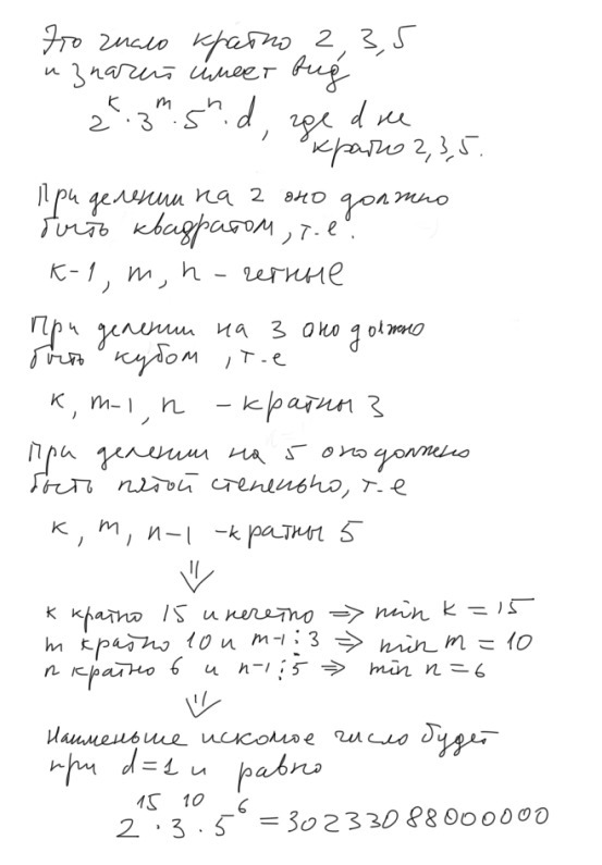 Найти наименьшее натуральное число, являющееся одновременно удвоенным квадратом, утроенным кубом и умноженной на 5 пятой степенью натурального числа. 50 БАЛОВ
