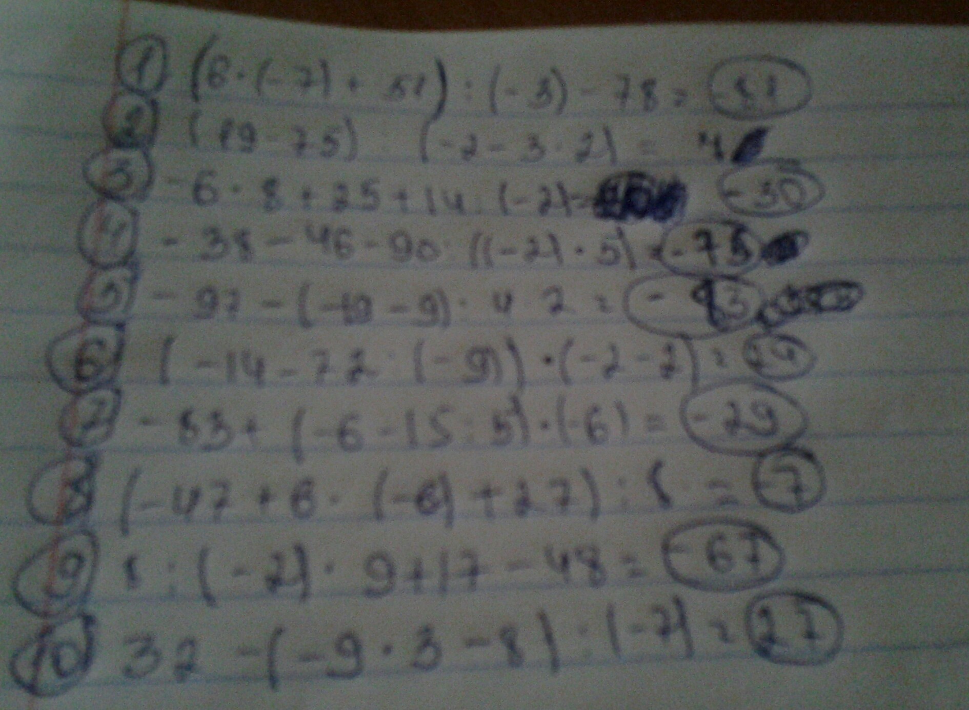 помогите пожалуйста 1) (6*(-7)+51):(-3)-78. 2) (19-75):(-2-3*2). 3) -6*8+25+14:(-2). 4) -38-46-90:((-2)*5). 5) -97-(-19-9):4*2. 6) (-14-72:(-9))*(-2-2). 7) -83+(-6-15:5)*(-6). 8) (-47+6*(-6)+27):(+8). 9) 8:(-2)*9+17-48. 10) 32-(-9*3-8):(-7).