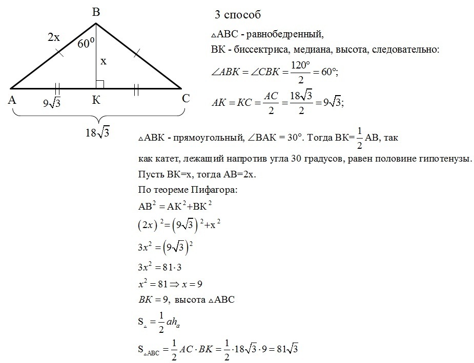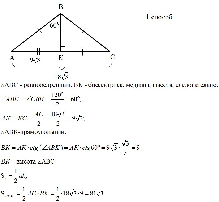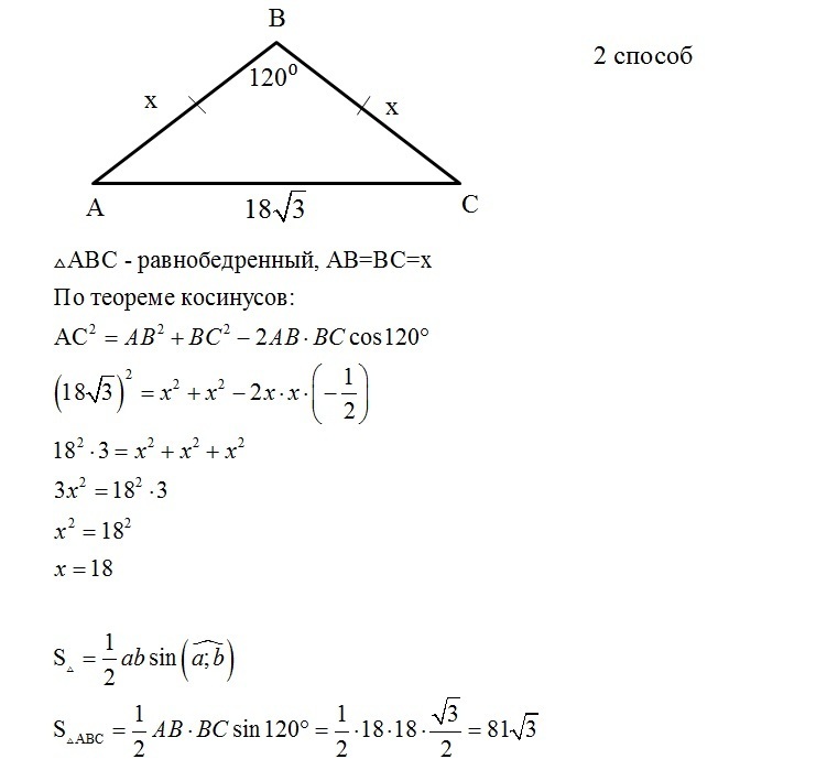 Угол при вершине равнобедренного треугольника равен 120, а основание 18 корень из 3 . найти площадь