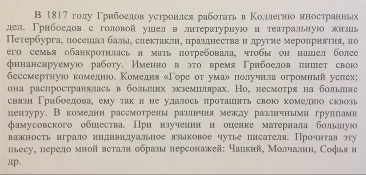 В 1817 году Грибоедов устроился работать в Коллегию иностранных дел. Александр Сергеевич с головой ушел в литературную и театральную жизнь Петербурга, посещал балы, спектакли, празднества и другие мероприятия, но его семья обанкротилась, и мать потребовала, чтобы сын нашел более финансируемую работу. Именно в это время Грибоедов пишет свою бессмертную комедию. Пьеса "Горе от ума" имела огромный успех; она выходила значительными тиражами. Но, несмотря на большие связи, автору так и не удалось миновать цензуру. В комедии изображаются противоречия между различными группами фамусовского общества. При изучении и оценке материала важную роль играло авторское языковое чутье. Прочитав "Горе от ума", я представил перед собой многих персонажей пьесы: Чацкого, Молчалина, Софью и других.