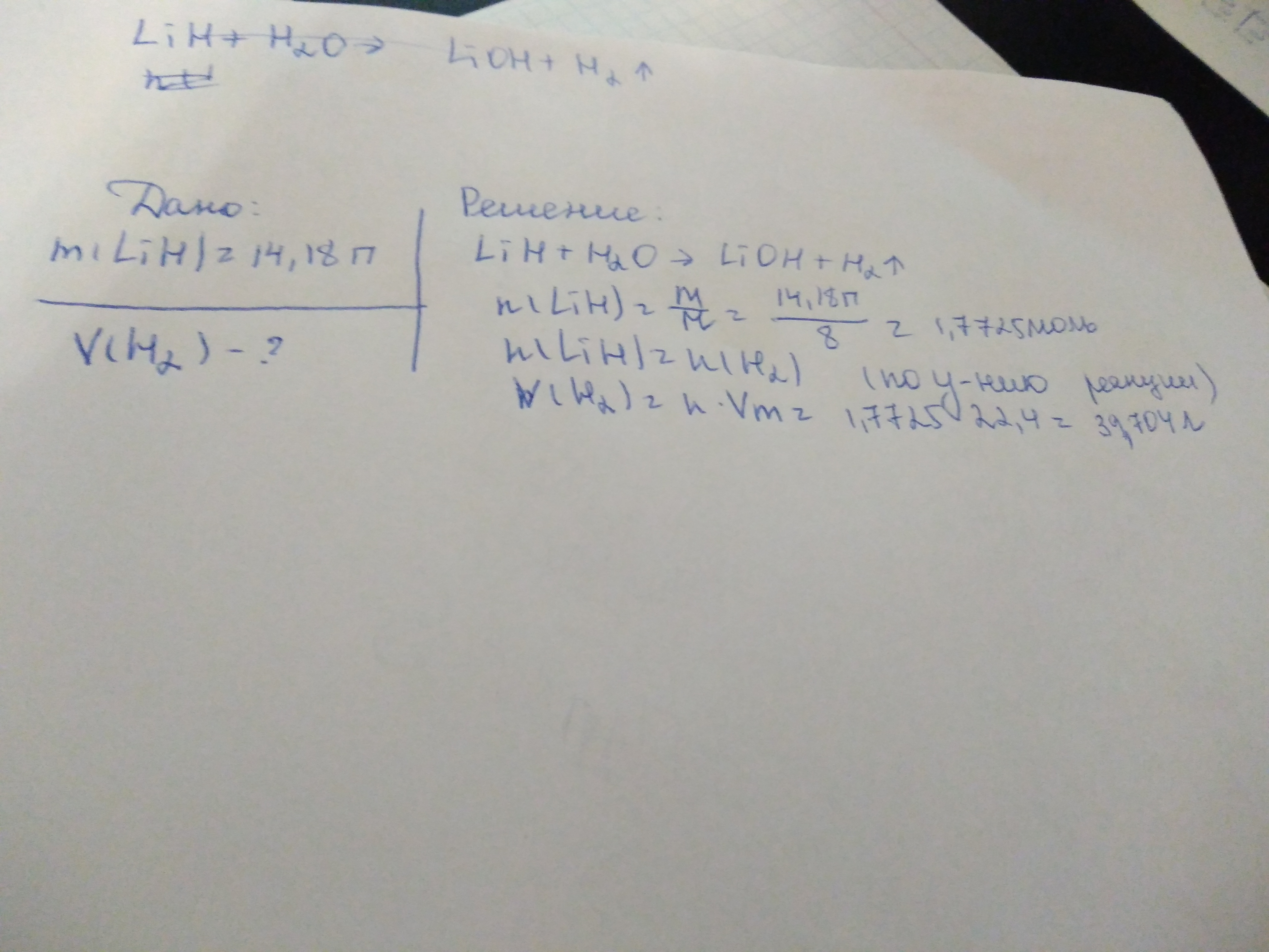 Какой объем газа (н.у.) можно собрать при обработке 14,18 г гидрида лития избытком воды? Ответ распишите подробно на листочке с дано и решением)