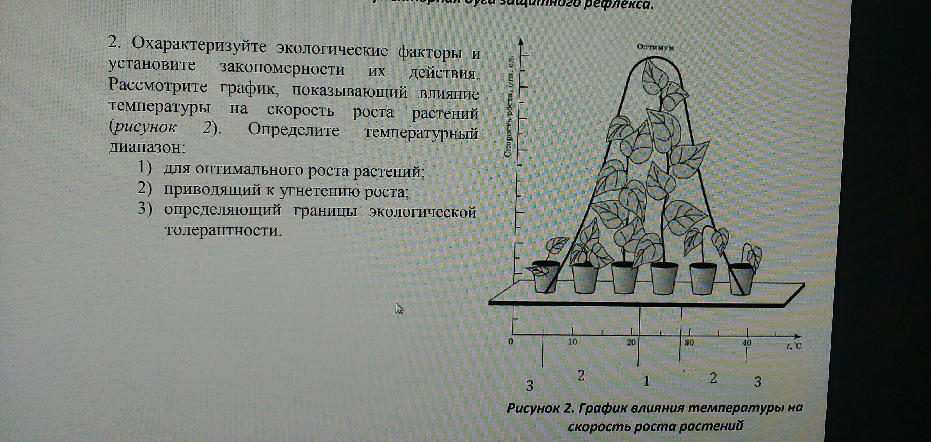 Рассмотрим график влияния температурного диапазона на рост растений: а) для оптимального роста растений необходима температура: 22 -28С.; б) угнетение роста происходит при температурах ниже 20 и выше 28 градусов по Цельсию; в) границы толерантности колеблются в пределах: от +5 до +20 и от +28 до + 38, за пределами этих температур наступает гибель растения.