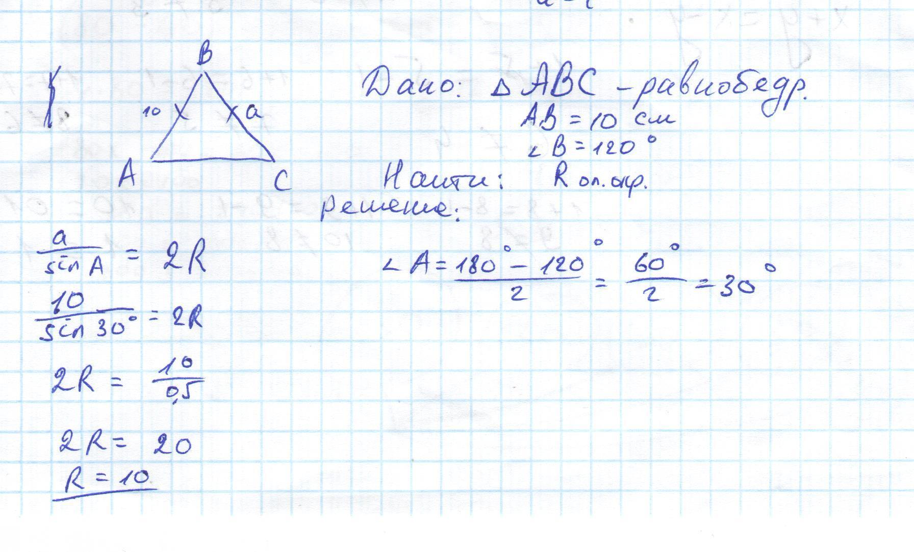 Боковая сторона равнобедренного треугольника равна 10 см угол образованный боковыми сторонами 120 градусов Найдите радиус окружности описанной около этого треугольника
