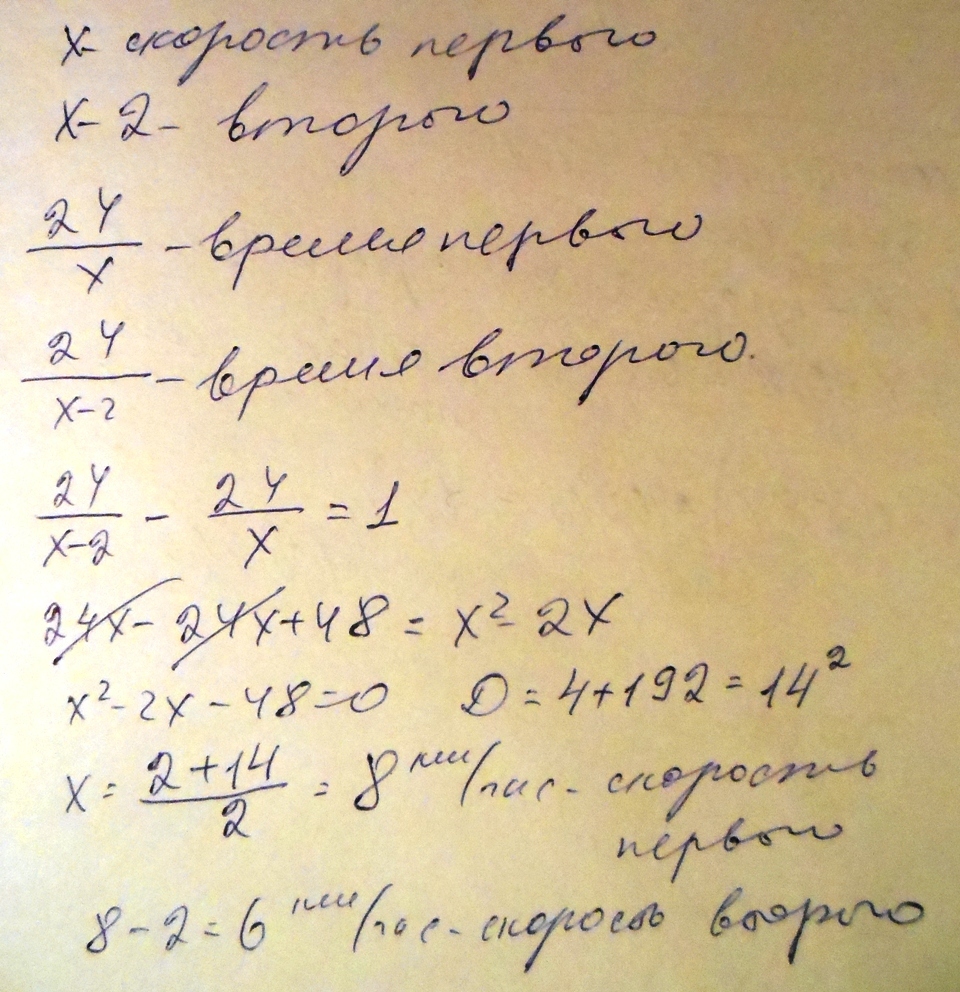 Два велосипедиста выехали одновременно навстречу друг другу из городов А и В. Первый проезжает в час на 2 км больше второго и приезжает в В на 1ч раньше, чем второй в А. Расстояние от А до В 24км. Определите скорость первого велосипедиста.