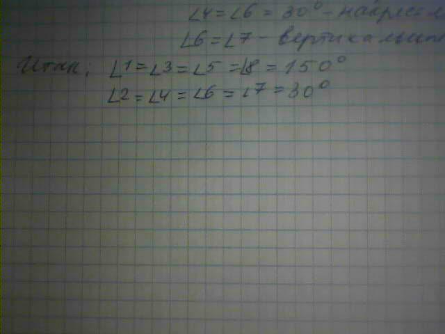 Найдите все углы,образованные при пересечении двух параллельных прямых a и b секущей c если 1) один из углов равен 150 градусов