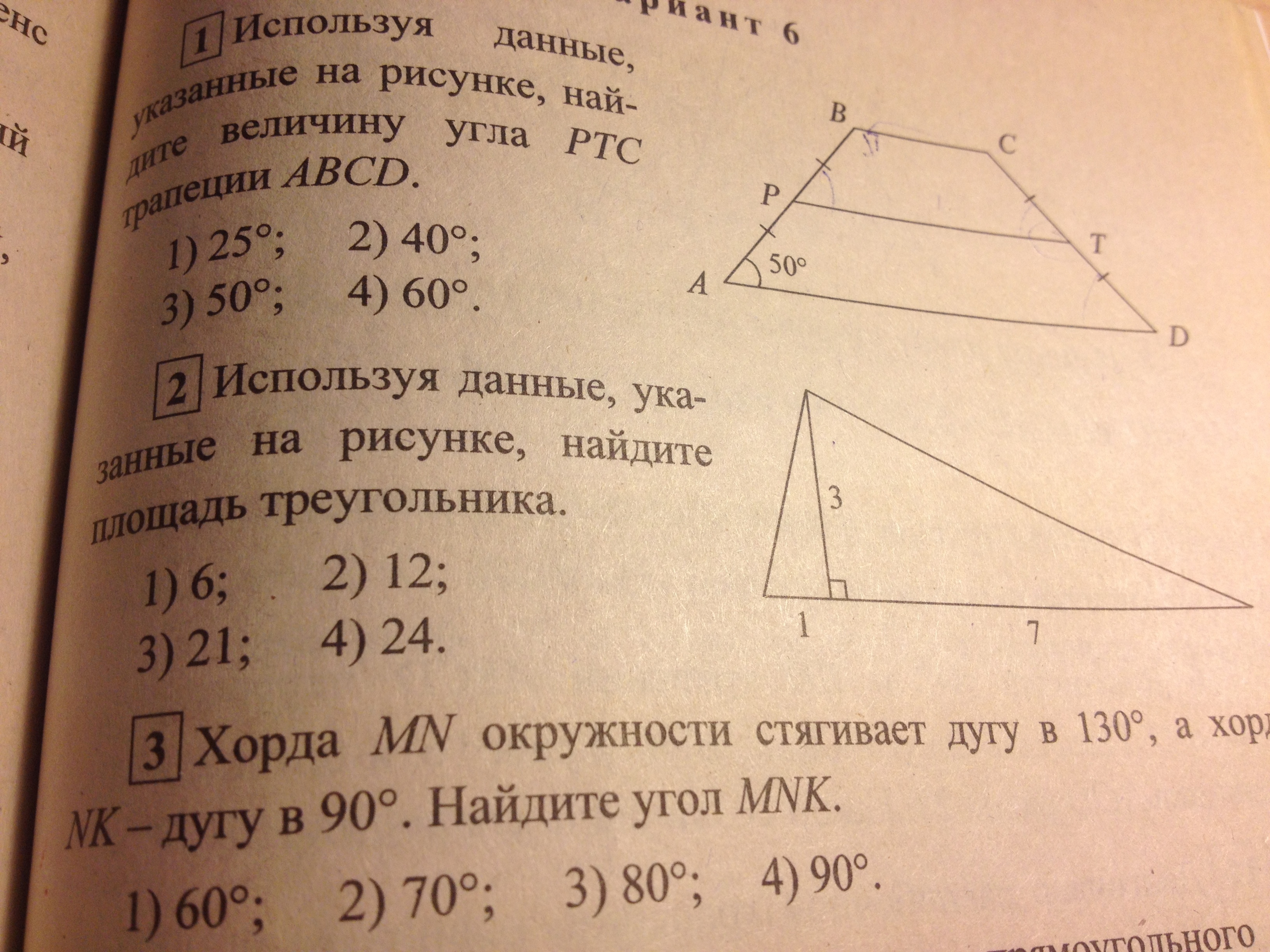 1) ИСПОЛЬЗУЯ ДАННЫЕ, УКАЗАННЫЕ НА РИСУНКЕ, НАЙДИТЕ ВЕЛИЧИНУ УГЛА PTC ТРАПЕЦИИ ABCD.
