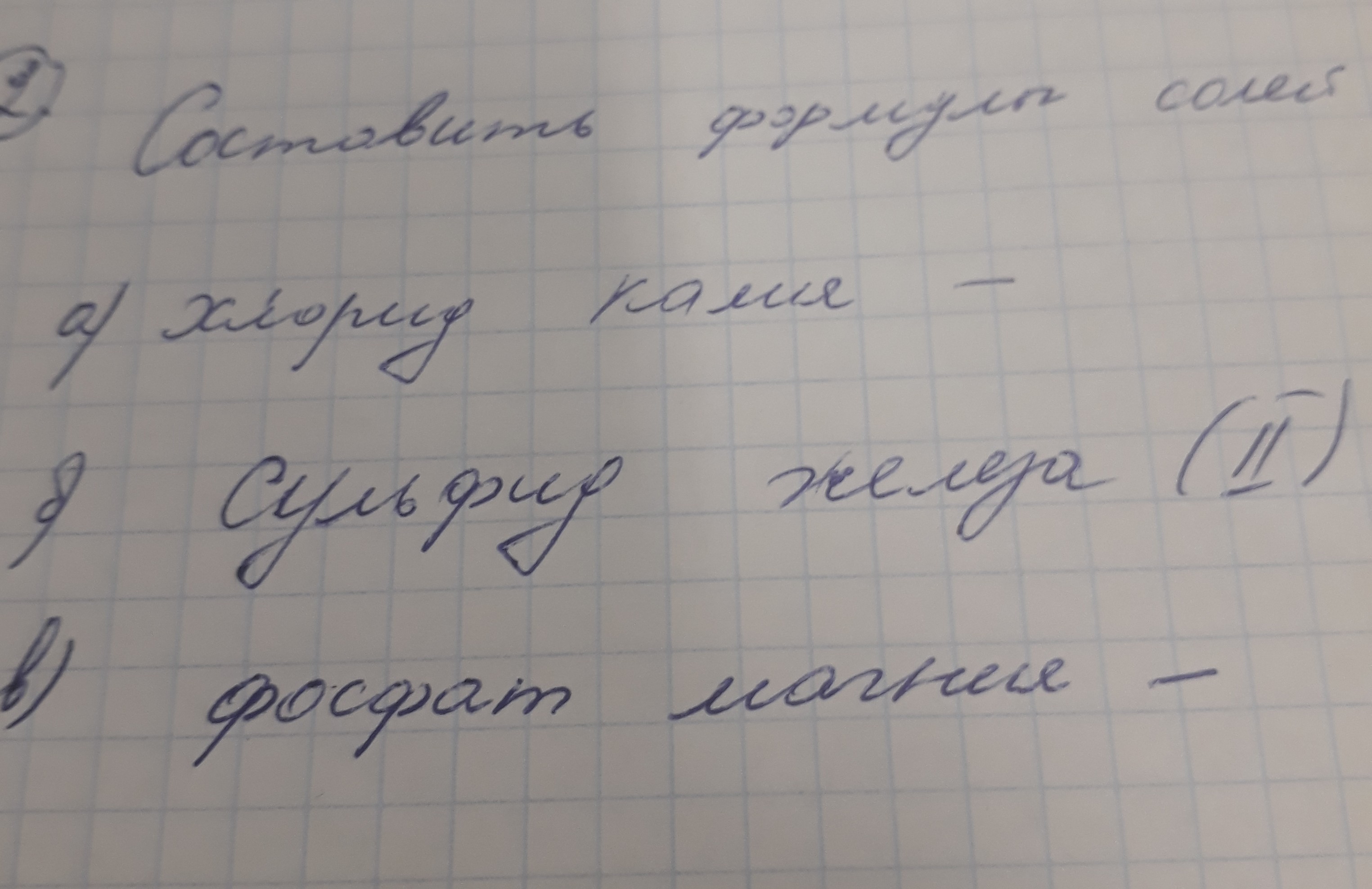 Составьте формулы солей a) хлорид калияб)сульфид железа2в)фосфат магния срочноо пожалуйстаа