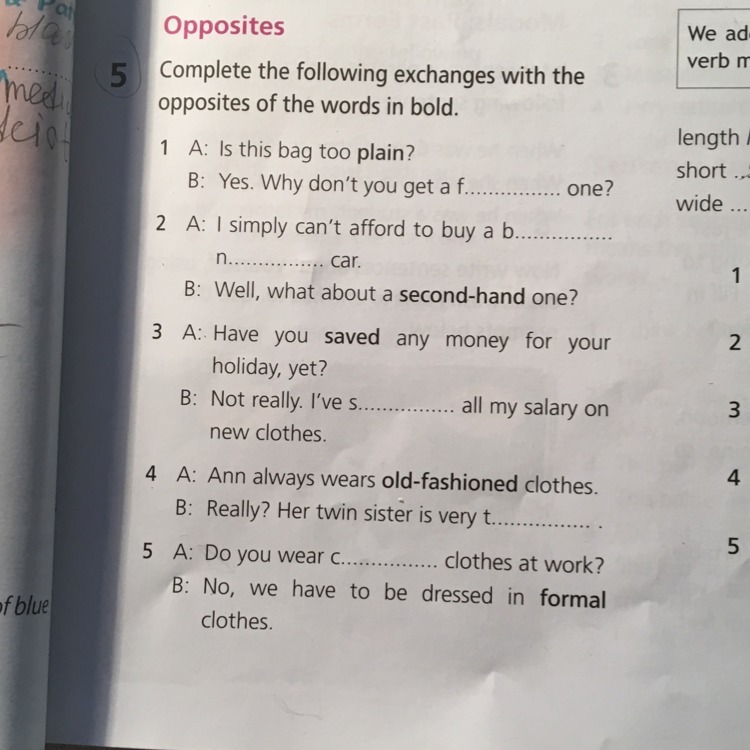 1- fashionable one, 2-brand new car, 3-spent, 4-trendy, 5-casual
