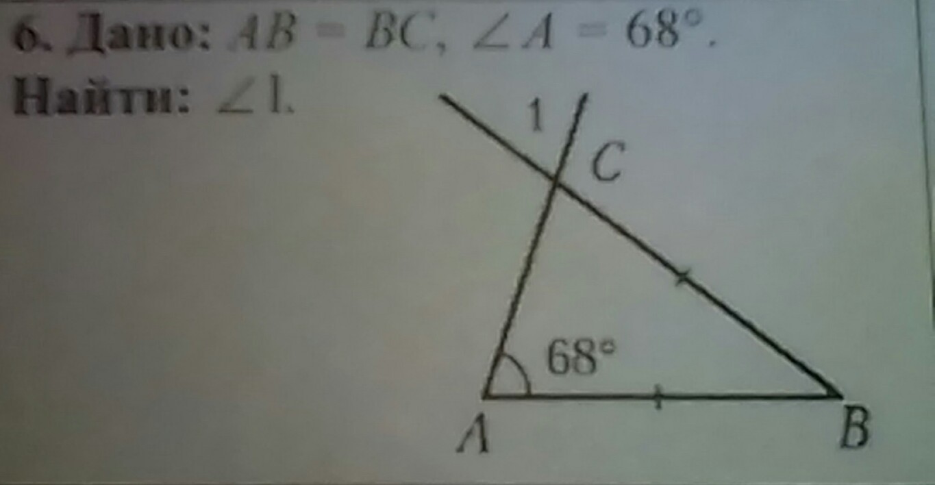 ab=bcb с обоих сторон сокращается и получается: а=с => c=68 градусовугол 1 равен углу С как вертикальные, следовательно угол 1 равен 68 градусамугол В равен 44 градусам( вдруг если понадобится)