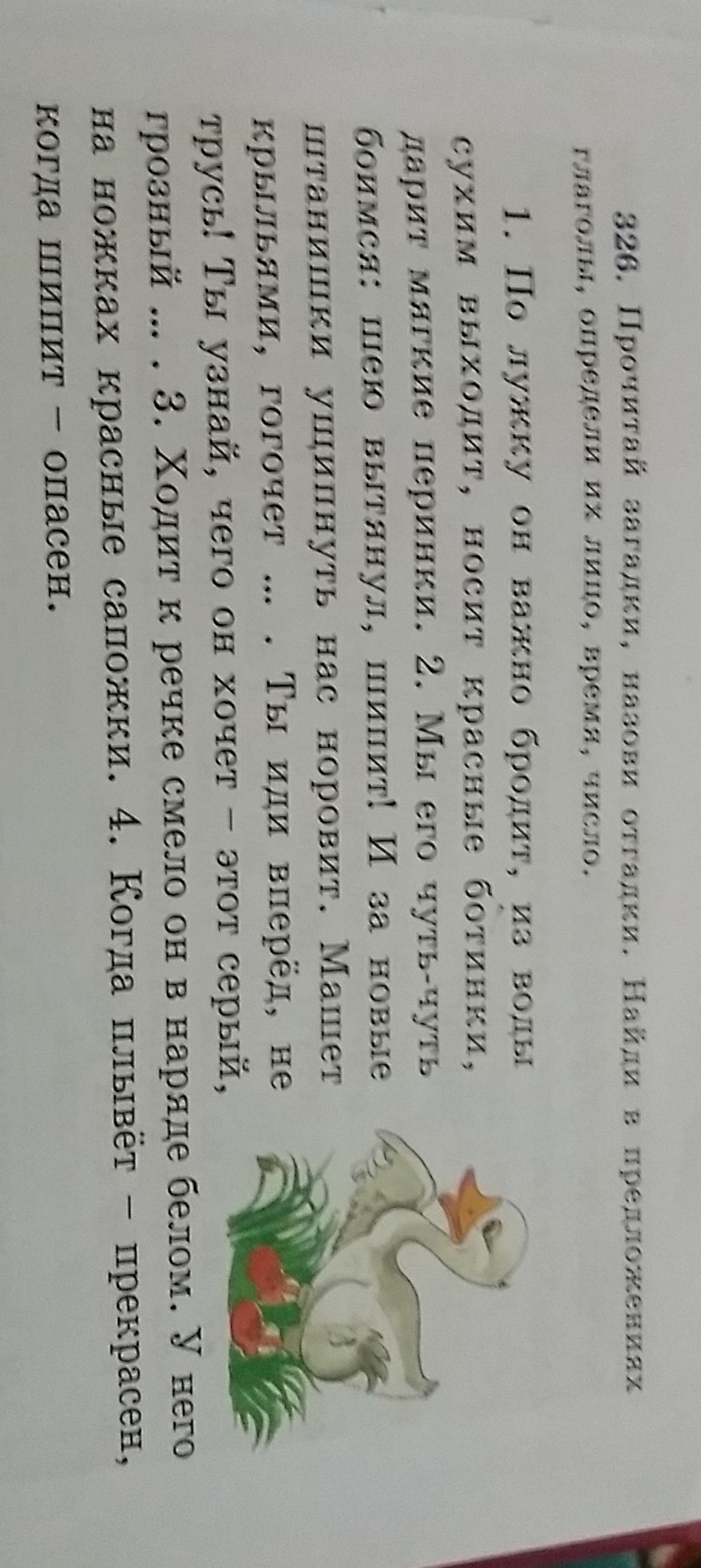 По лужку он важно бродит,из воды сухим выходит, носит красные ботинки,дарит мягкие перинки .... Прочитай загадки , назови отгадки . Найди в предложениях глаголы , определи их лицо ,врямя,число.
